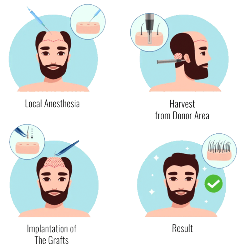 In this process, a surgeon uses the advanced least invasive technique to extract individual hairs from the donor area, usually the back of the head, by making hundreds to thousands of tiny punch incisions. These follicles are then relocated to the donor’s site by making tiny holes in the area. After the transplant, the head is covered with gauze or bandages for a few days. In this process, hundreds and thousands of hair follicles are transplanted simultaneously.